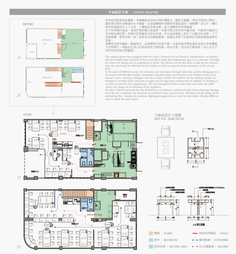 拆除建物原先的雙梯結構,以增加空間尺度,達到動線的流暢與座位的舒適度。一二樓餐區分別劃設單人、多人桌及包廂區,因應每位消費者的不同需求,亦針對各區域綴以風格軟裝,形塑場域間的無形軸線。