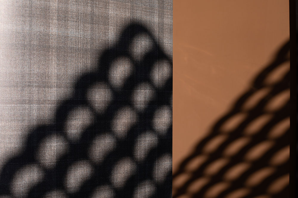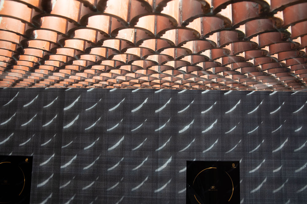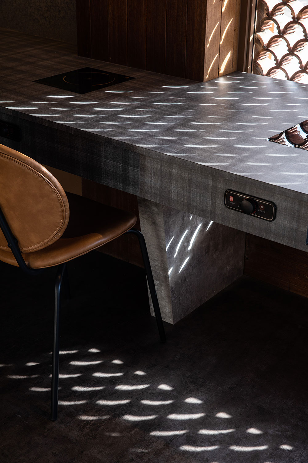 一樓單人桌區通透玻璃窗外,取其瓦窯立面,以弧形組構;一則以窯燒的手作溫度,呼應鍋物中火的元素,拓延至室內空間;二則遮蔽對向停車場的紊亂視角,亦形塑用餐隱私;當日光灑落襯出材料輪廓,堆疊出光影層次,形構出美好光景。