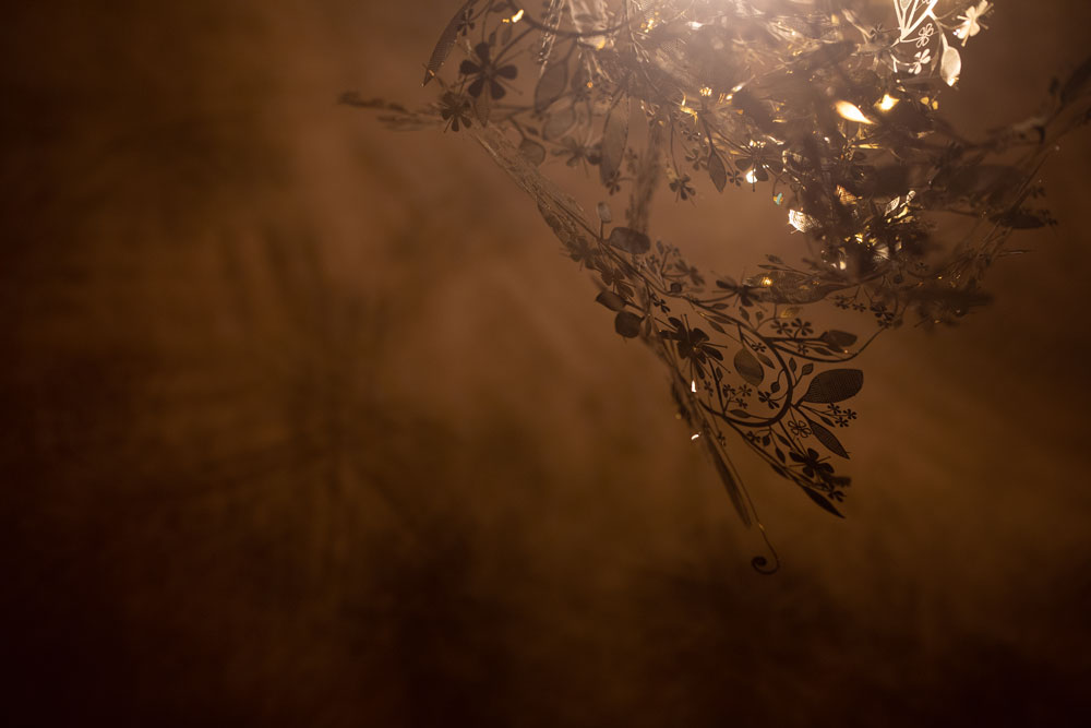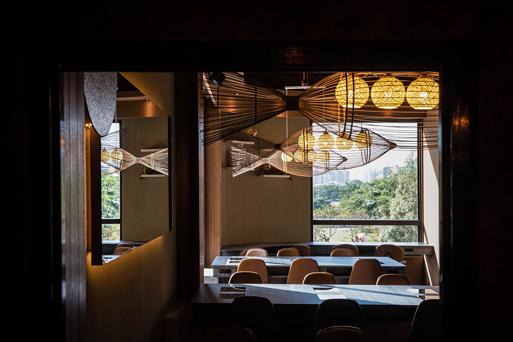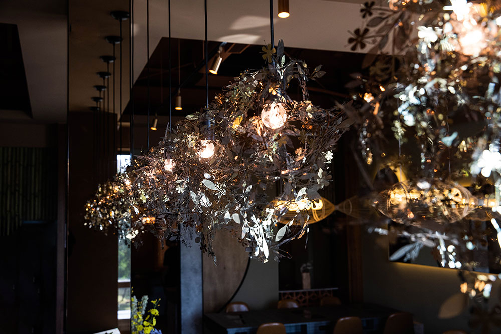 呼應食材的新鮮原味,二樓餐區以魚狀竹編吊燈,應和竹盤、竹牆,連貫空間對話。處居中位置的單人桌上方,掛以枝葉吊燈,以金屬剪手工裁形錯落相偕,與戶外綠意虛實相應。通透的鏡面材質,放大空間視感,援引窗外光景舒緩心緒,綠意扶疏魚貫而行,裡外生機串連一室。
