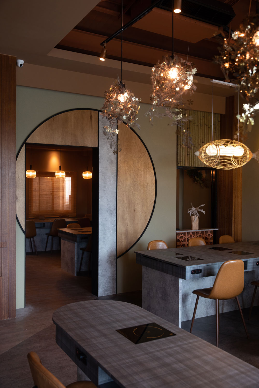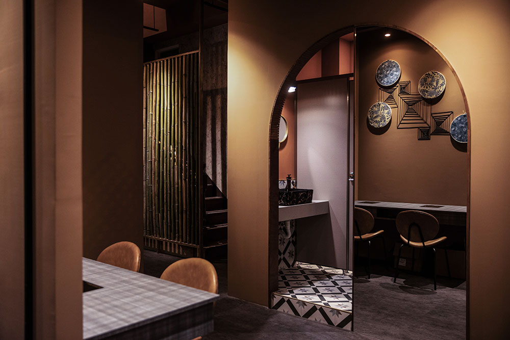 空間中運用許多圓形語彙,如鏡面、燈飾,以寓意圓融、圓滑,柔和用餐氛圍。一樓化妝間外設置一圓拱門,牆上大片鏡面投射竹筐內嵌編織的意象造型,為空間鋪展藝術氣息,盡攬餐食間的歡聲笑語。