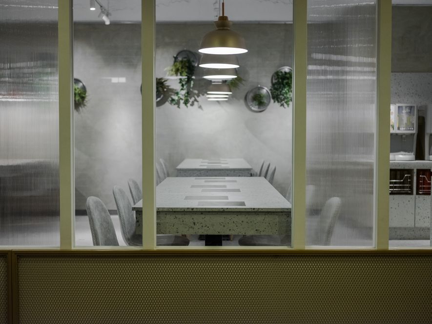 毗鄰廊道的開窗以霧面中空板及透明玻璃相間其中,上下接連金屬網,放眼延伸至室內,吸引著過路客的目光,也讓在內用餐的客人,保有半遮蔽的隱私感,能自在地享用鍋物。
