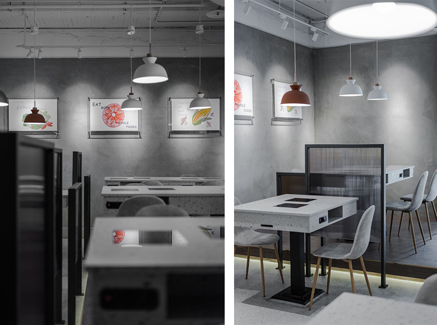 走道間距予以寬敞劃設,座位區則利用半立地式金屬中空版隔間,使區域間保有適當距離而不顯隔閡,整體視感通透流暢。而垂掛天花的紅白燈具,明亮了整個空間,呼應鍋物食材,從視覺開胃,溫暖了人們。
